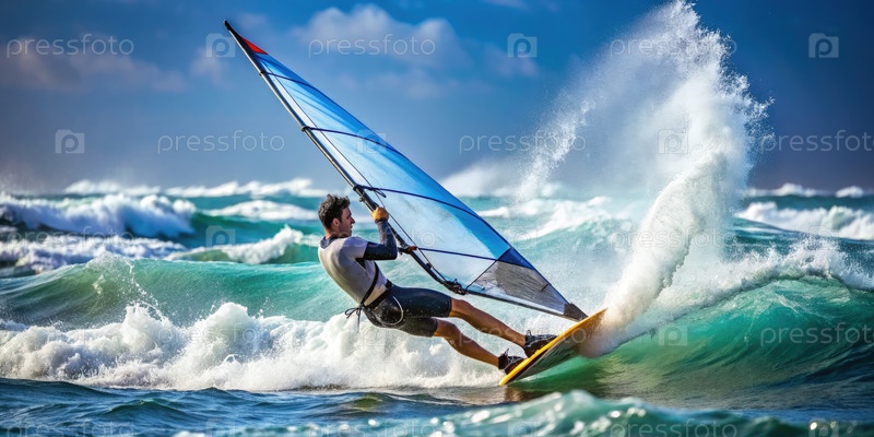 Виндсерфер, навигирующий по большим волнам в солнечный день