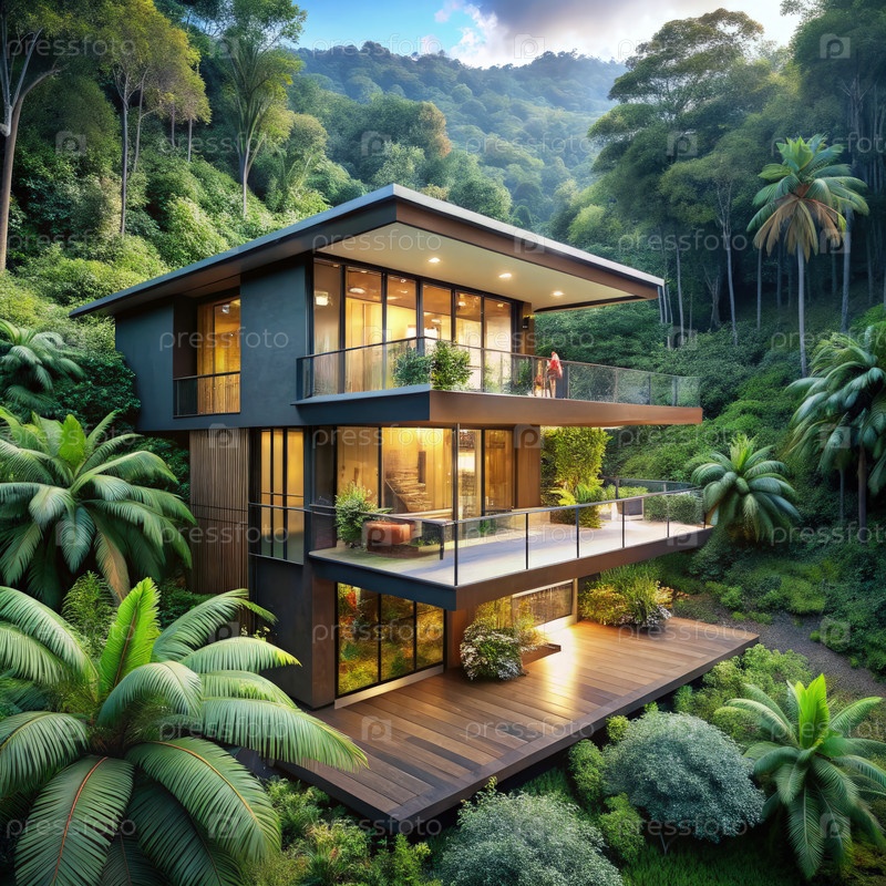 Дом, расположенный в пышном ландшафте джунглей Окружен тропическими растениями на закате