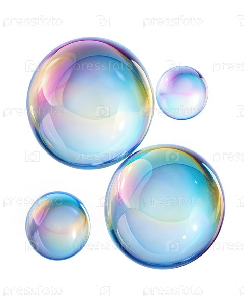 Три радужных мыльных пузыря, плавающие на белом фоне