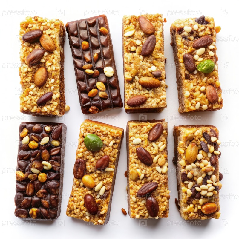 Вкусные сорта сладких энергетических баров, расположенных на белом фоне для здоровых вариантов закусок