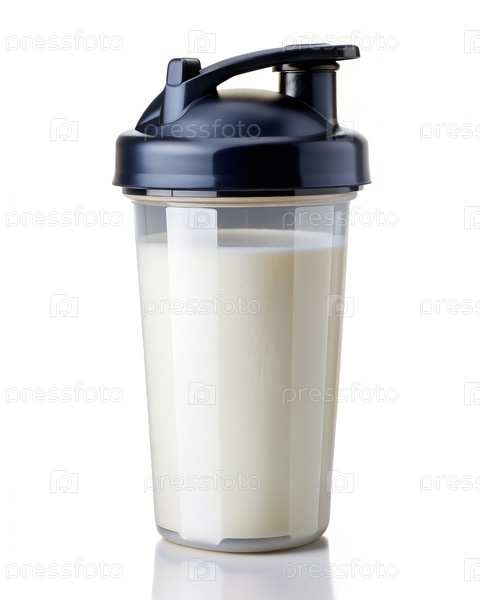 Спортивный шейкер с черной крышкой и белковой смесью, подготовленная к фитнес-программе на домашней кухне