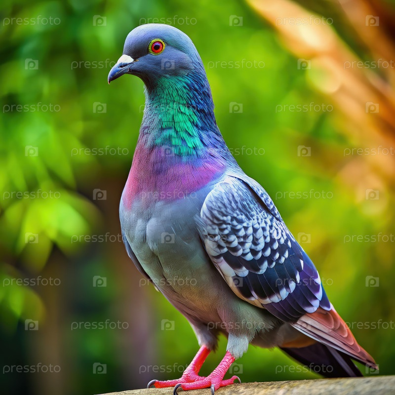Красочный голубь, гордо стоящий на деревянной скамейке в роскошном саду