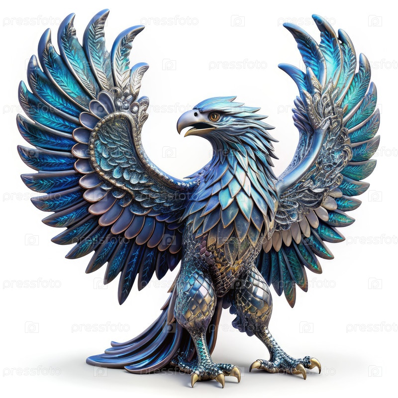 Ирридецентная металлическая серебряная скульптура благородного орла с распространенными крыльями. генеративный AI