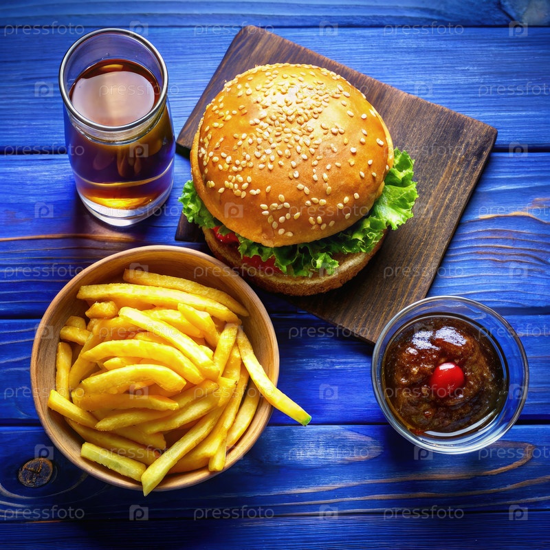 Классическое блюдо гамбургеров с картофелем и соусом на голубом деревянном столе