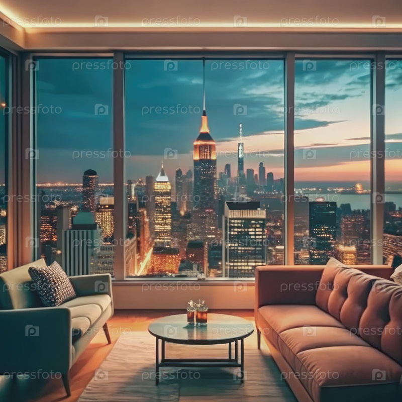 Современный апартамент-зал с видом на горизонт города в сумерках