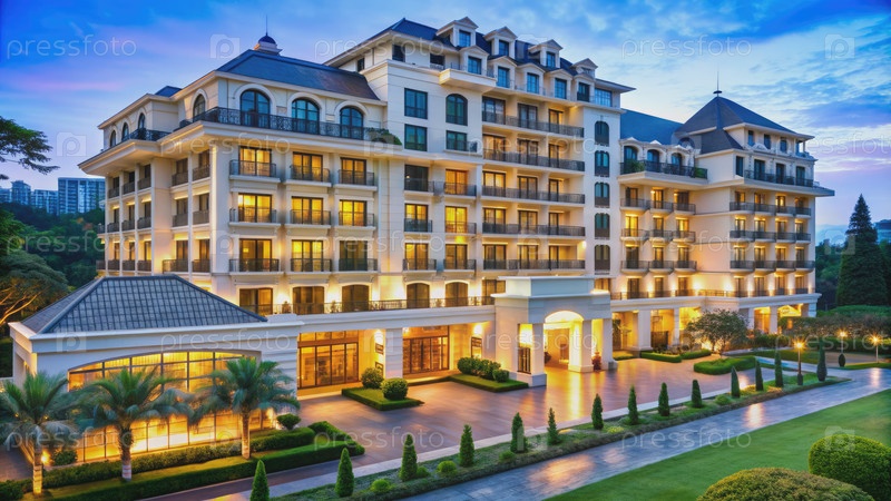 Элегантный экстерьер отеля в сумерках с роскошным ландшафтом
