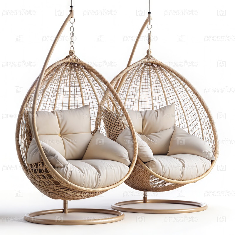 Виковые висячие качающиеся стулья с подушками, изолированными на белом фоне