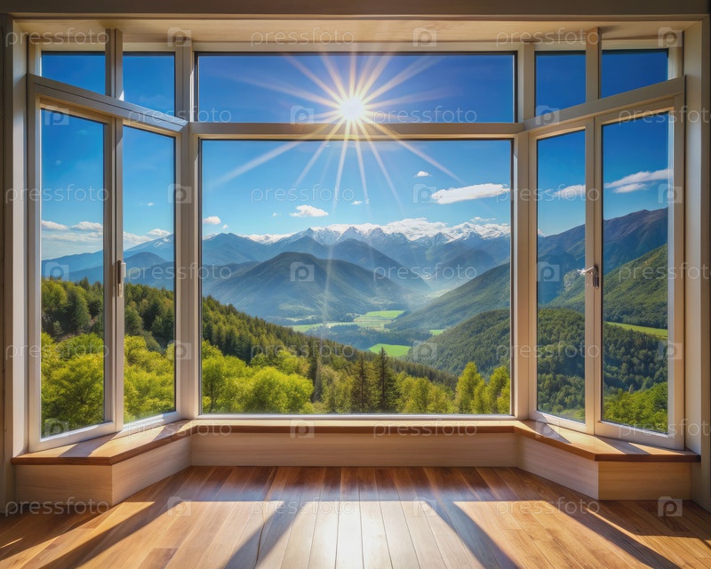 Панорамный вид на горы из большого окна залива с потоковым солнечным светом. генеративная ИИ