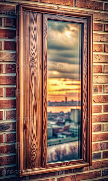 Высокая прямоугольная картина заката солнца, отраженная в раме окна с видом на городской пейзаж