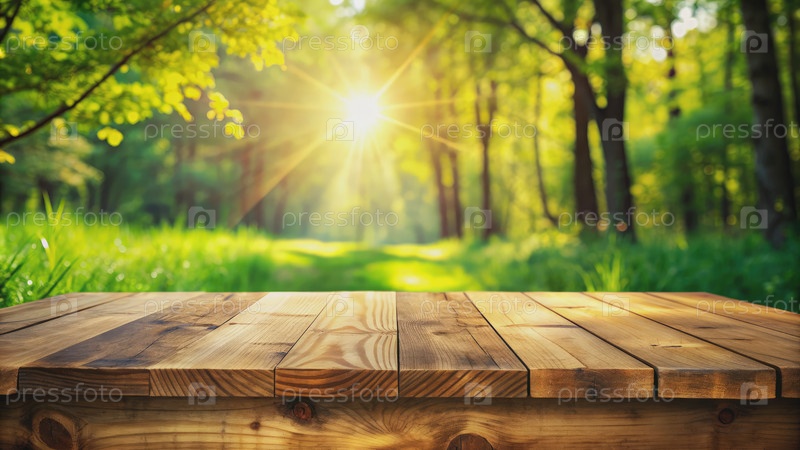 Мирное утро в природе с солнечным светом, стекающим по деревянному столу