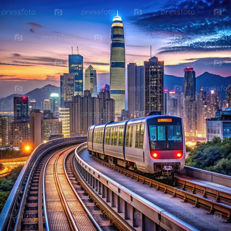 Гонконгский поезд МТР путешествует по городскому ландшафту ночью