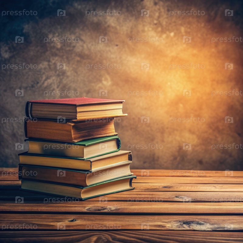 Наложенные книги на деревянный стол с твердым цветовым фоном при теплом освещении