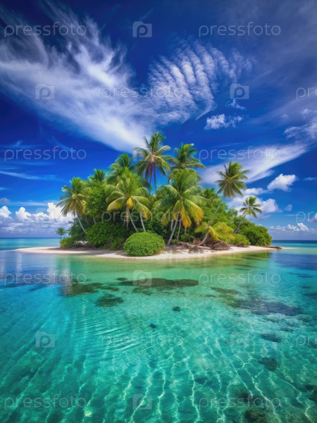Тропический остров-рай с пальмами и чистой водой под голубым небом