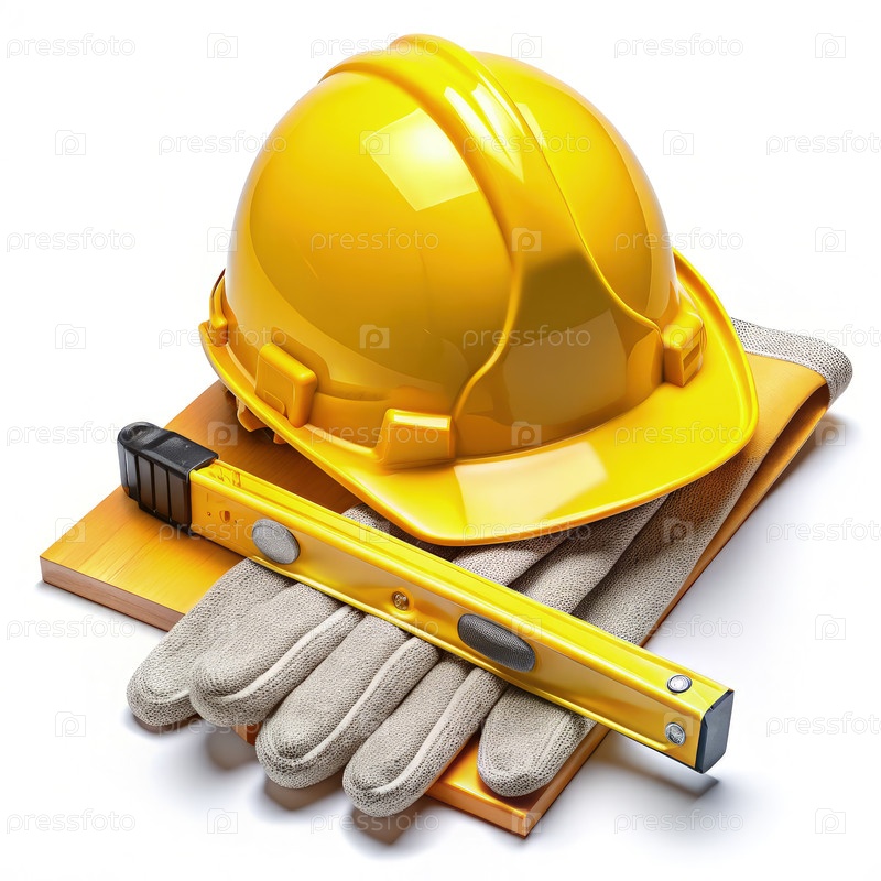 Желтая жесткая шляпа, перчатки и уровень на строительной площадке
