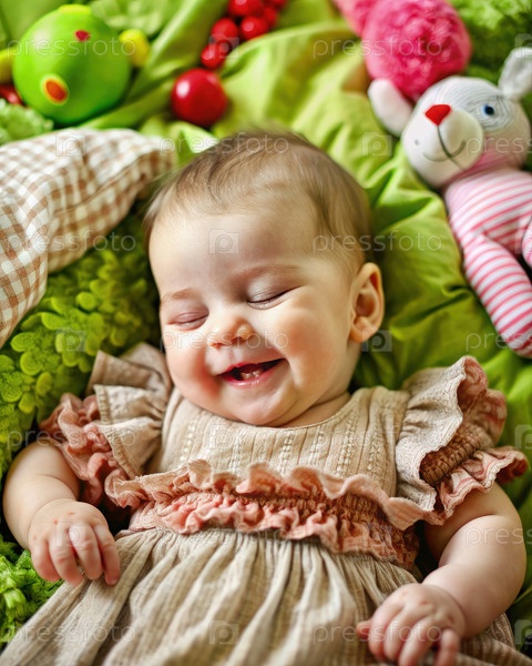 Очаровательный ребенок улыбается, когда спит на красочной кровати в окружении игрушек