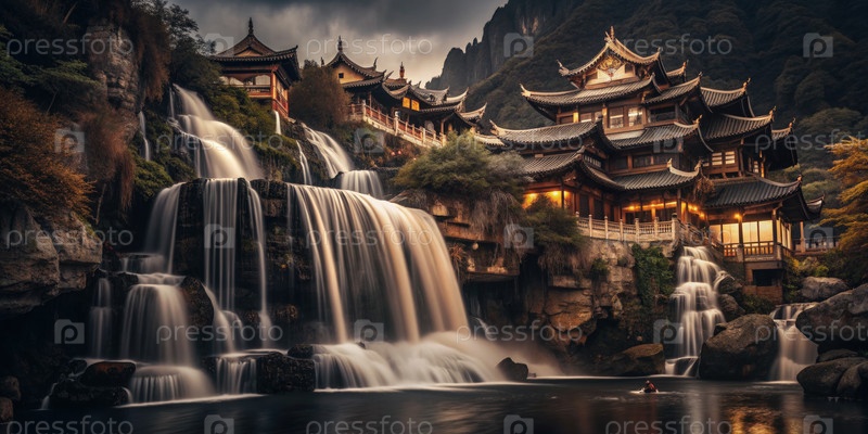 Величественный водопад каскадирует через древнюю архитектуру среди пышного зеленого пейзажа на закате