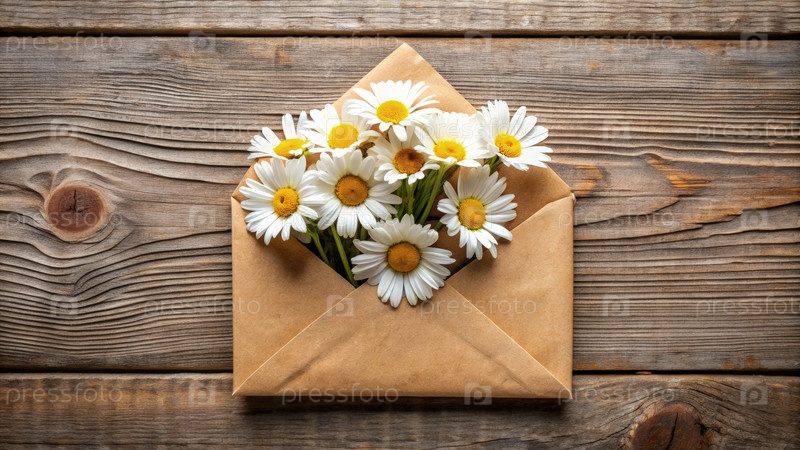 Свежие ромашки красиво расположены внутри коричневого конверта на деревянной поверхности