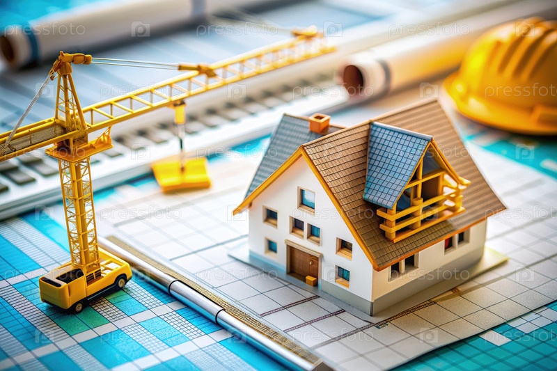Строительный проект с модельным домом и краном по плану проекта. генеративный ИИ