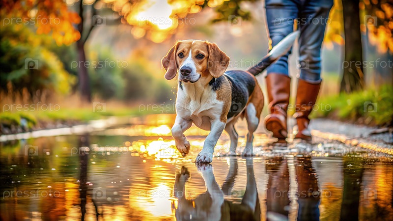 Счастливый бейгл-собака, идущая рядом с хозяином в Осеннем парке во время Золотого часа
