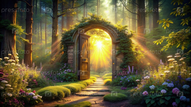 Древняя дверь, открывающаяся к солнечной лесной тропе
