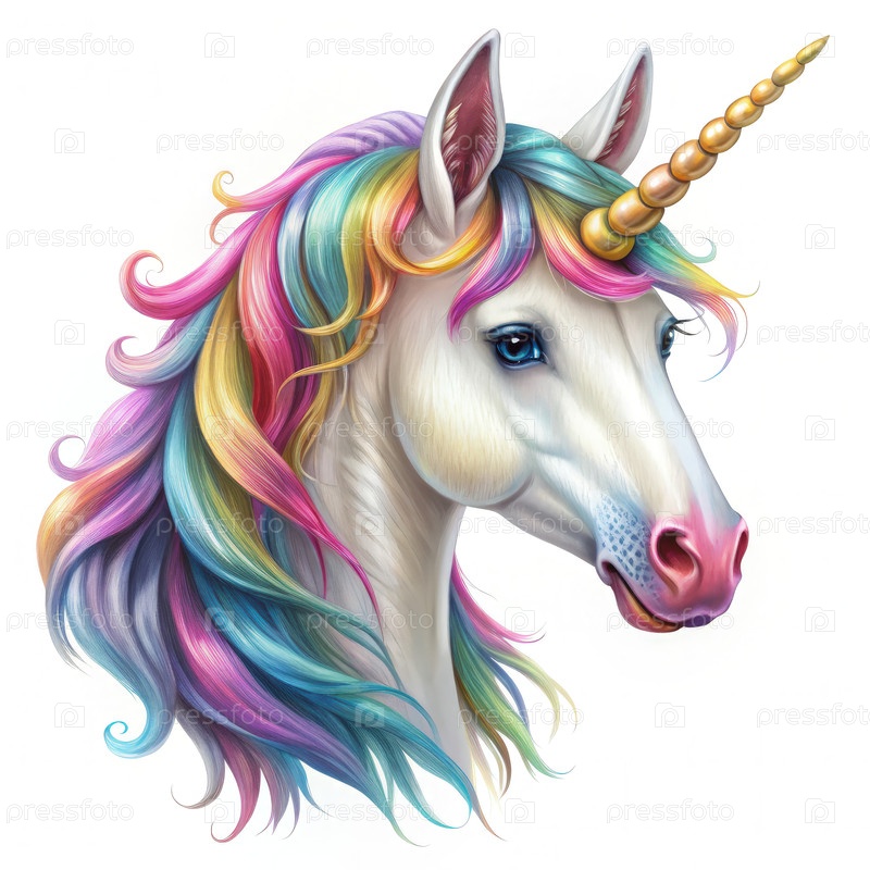 Белая голова единорога с радужной гребенью на белом фоне