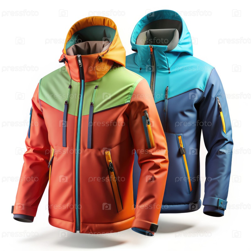 Два красочных водонепроницаемых капюшонированных куртки с молниеносными карманами на белом фоне