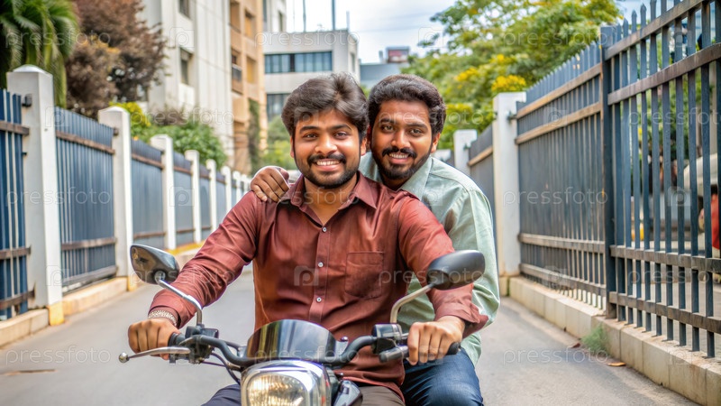 Два друга ездят на мотоцикле по жилой улице