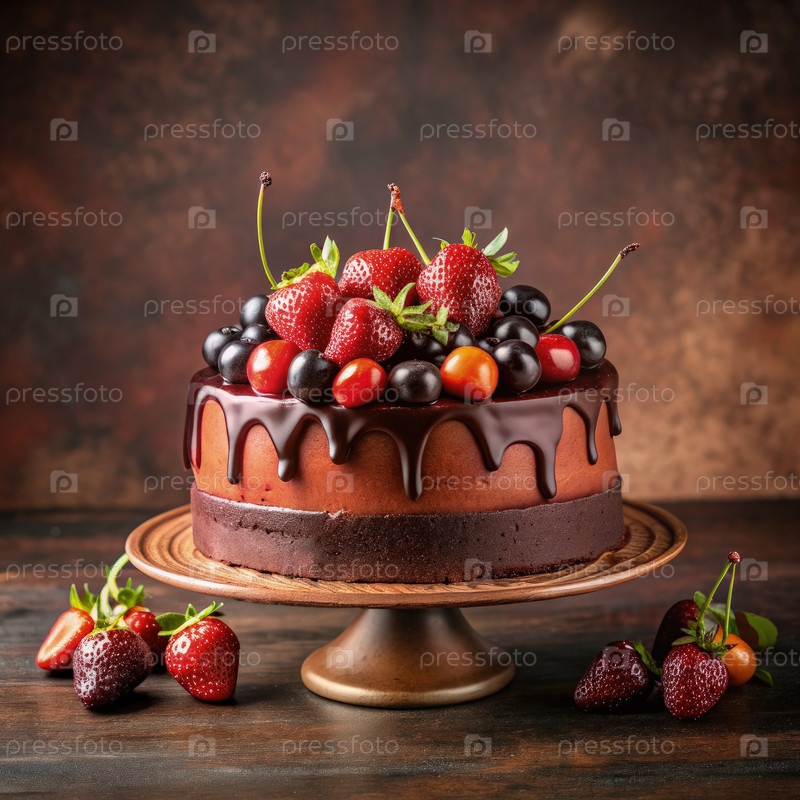 Шоколадный торт с ягодами на деревянном столе
