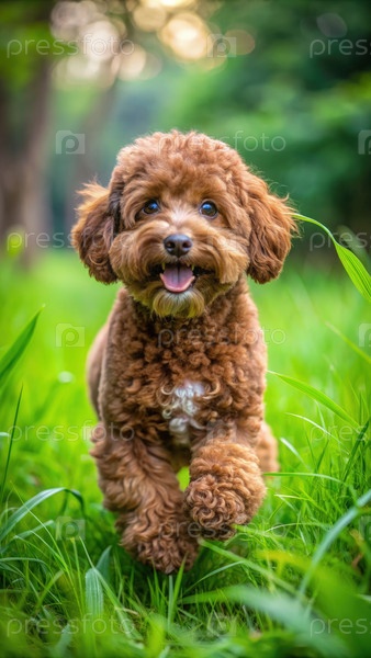 Коричневый пудель, бегущий по высокой зеленой траве в солнечный день