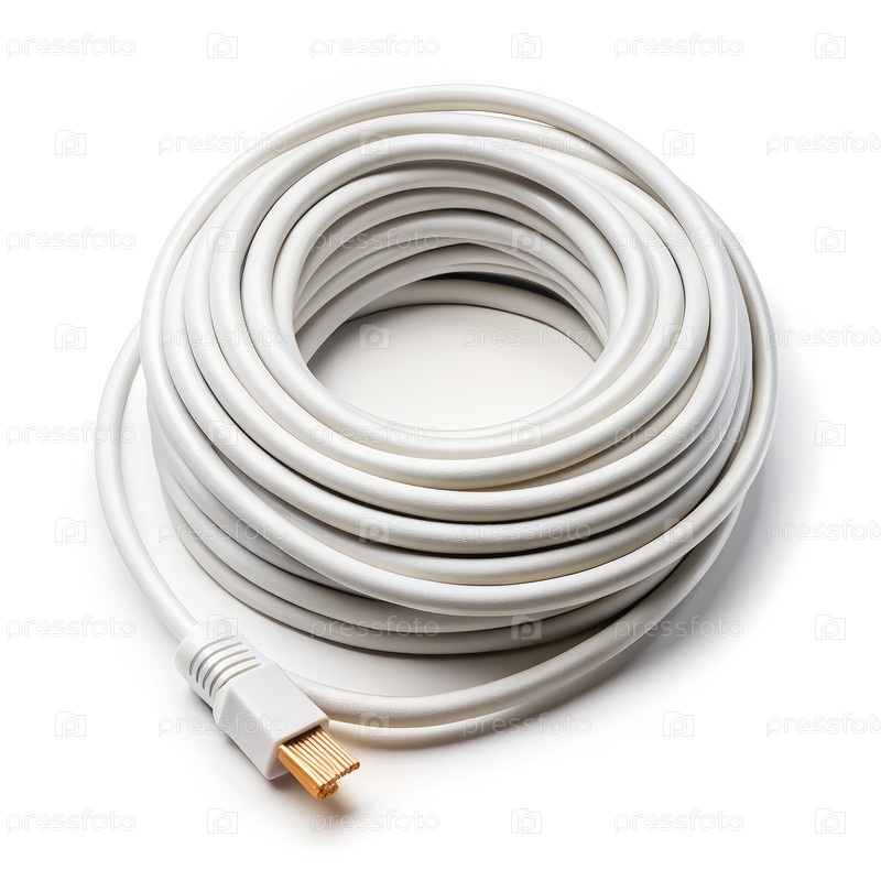 Свернутый белый кабель с позолоченным разъемом, изолированный на белом фоне