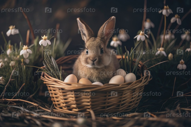 Милый коричневый кролик в корзине с яйцами