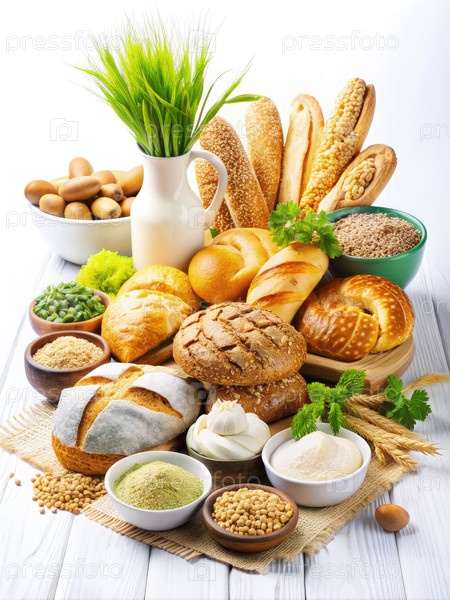Состав свежевыпеченного хлеба и зерновых на белом деревянном столе