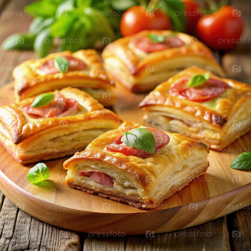 Вкусные пирожные с красной пестой и ветчиной, подаваемые на деревянном блюде