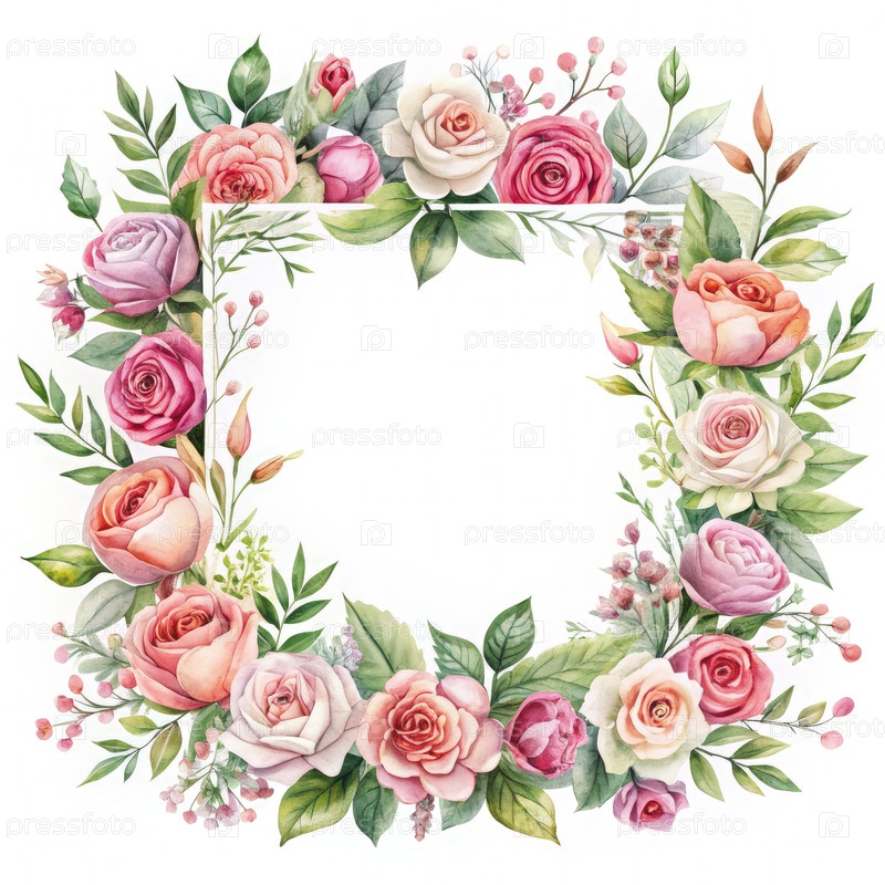 Акварельная цветовая рама с розами и листьями. генеративный AI