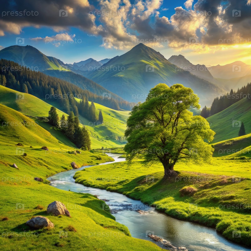Потрясающие зеленые холмы и текущая река под величественными горами на закате