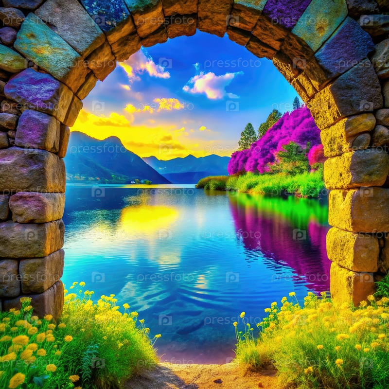 Спокойный вид через каменную арку горного озера на закате