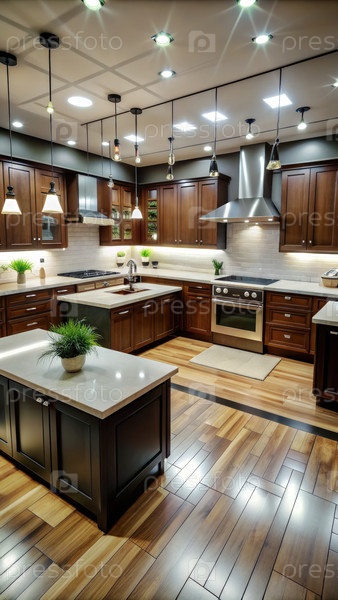 Кухня с островом и подвесным освещением. генеративный современный ИИ