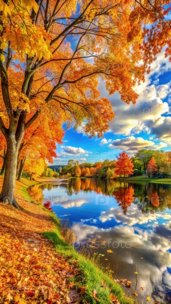 Живой осенний пейзаж с золотыми деревьями, отражающимися в спокойной воде озера