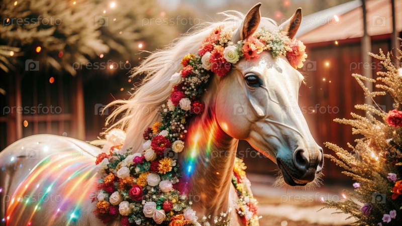 Блестящий радужный цветок, королевская лошадь в волшебном лесу