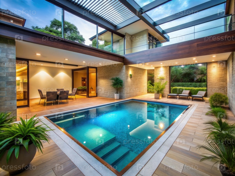 Элегантный частный бассейн, окруженный пышной зеленью в современном доме на рассвете