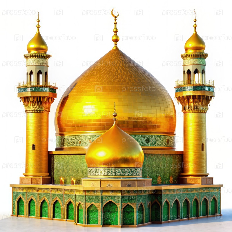Золотая мечеть с тремя куполами и минаретами на белом фоне