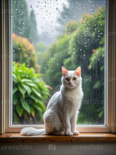 Белая кошка сидит у дождливого окна на подоконнике