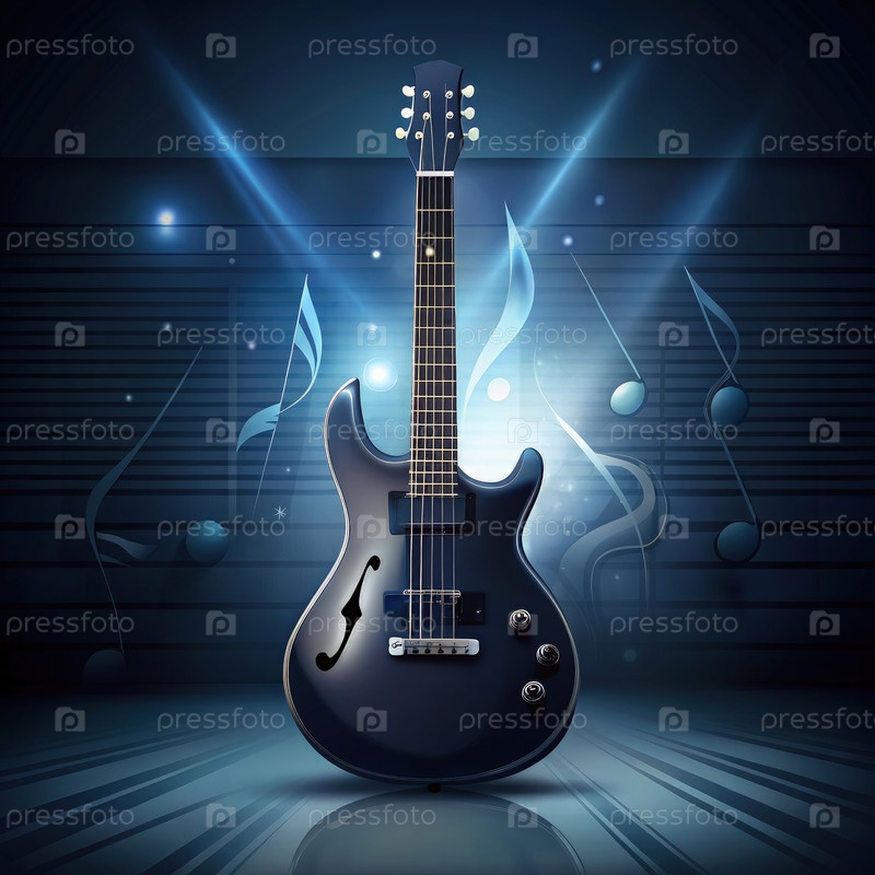 Динамический фон с гитарой под световым освещением сцены и музыкальными нотами вечером