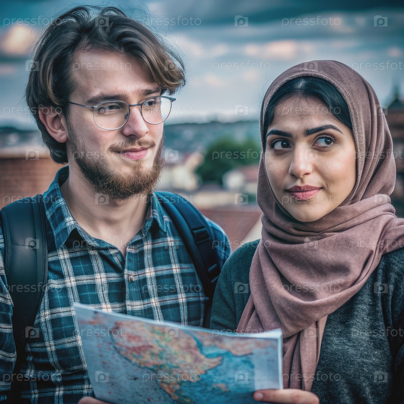 Пара, ориентирующаяся по городу с помощью карты во время прогулки за закатом