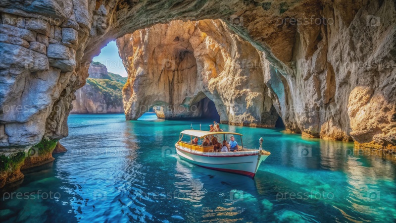 Туристическая лодка, исследующая пещеру Буэ Марино в заливе Оросей