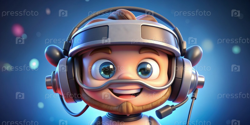 Веселый мультфильмовый персонаж с игровой гарнитурой занимается захватывающим виртуальным приключением на красочном фоне