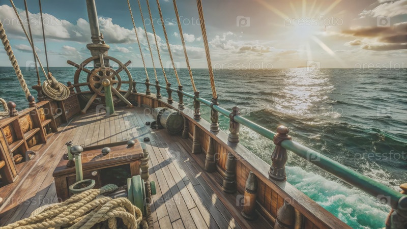 Вид с палубы большого деревянного корабля, плавающего в тихом море на закате