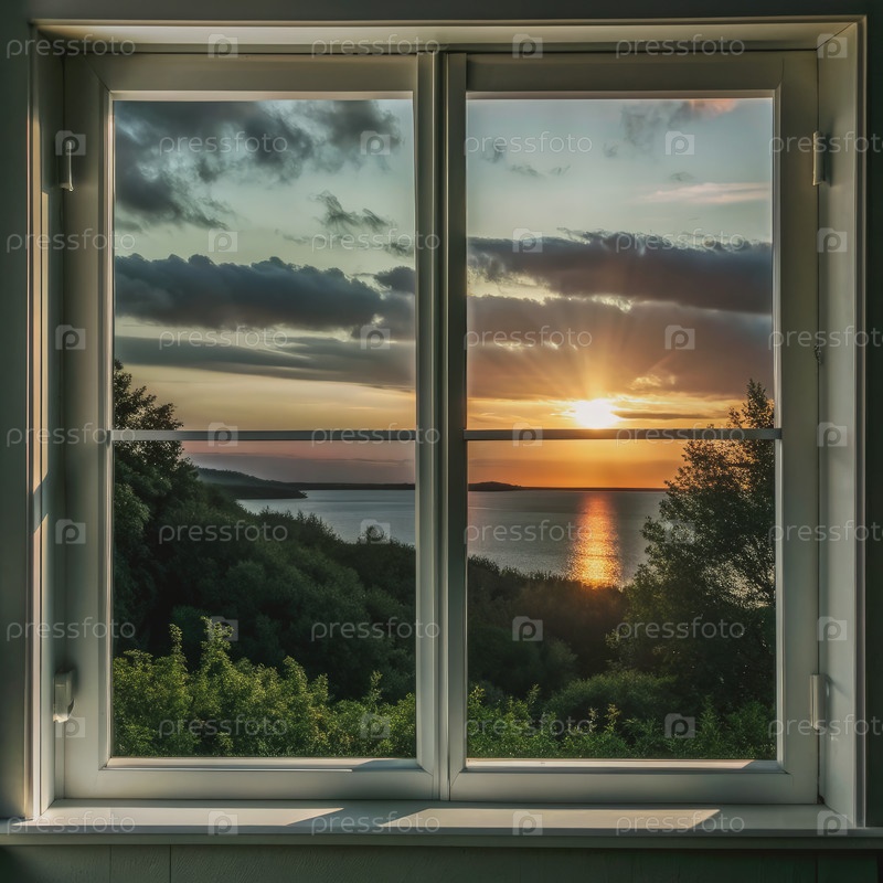 Зрительный вид на закат через окно