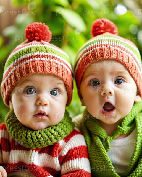 Два очаровательных малыша в полосатых свитерах и совпадающих трикотажных шляпах