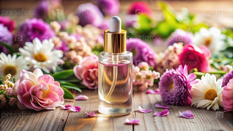 Бутылка парфюмерной сыворотки, окруженная цветами на деревянном столе